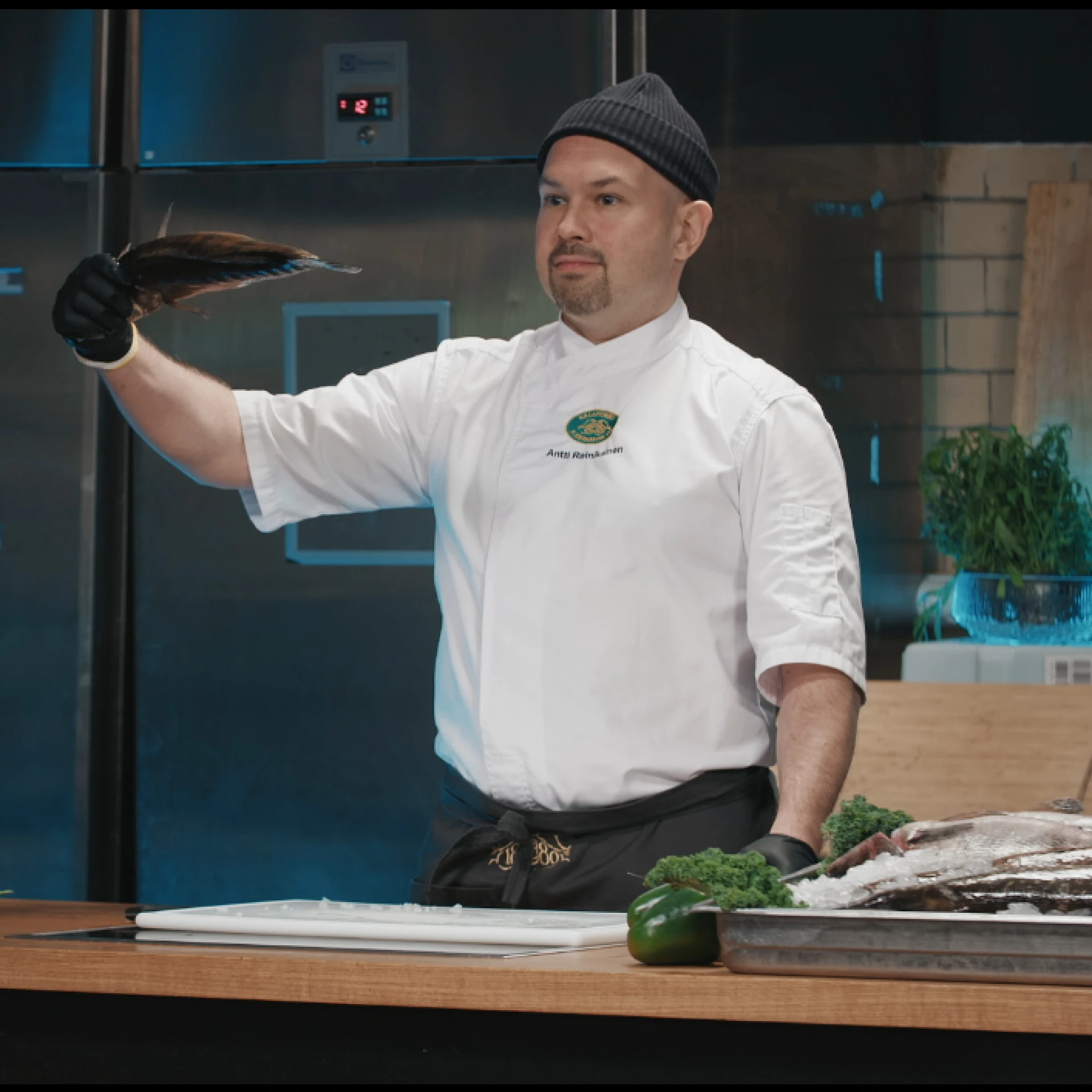 Kespron Erikoistukun Koulutusasiantuntija on esittelemässä perhosleikkaustekniikkaa, jossa meribassi avataan kauniisti kuin perhosen siivet. Ohjelmanumero sisältää leikkausnäytöksen sekä selostuksen kalan ominaisuuksista ja valmistuksesta.