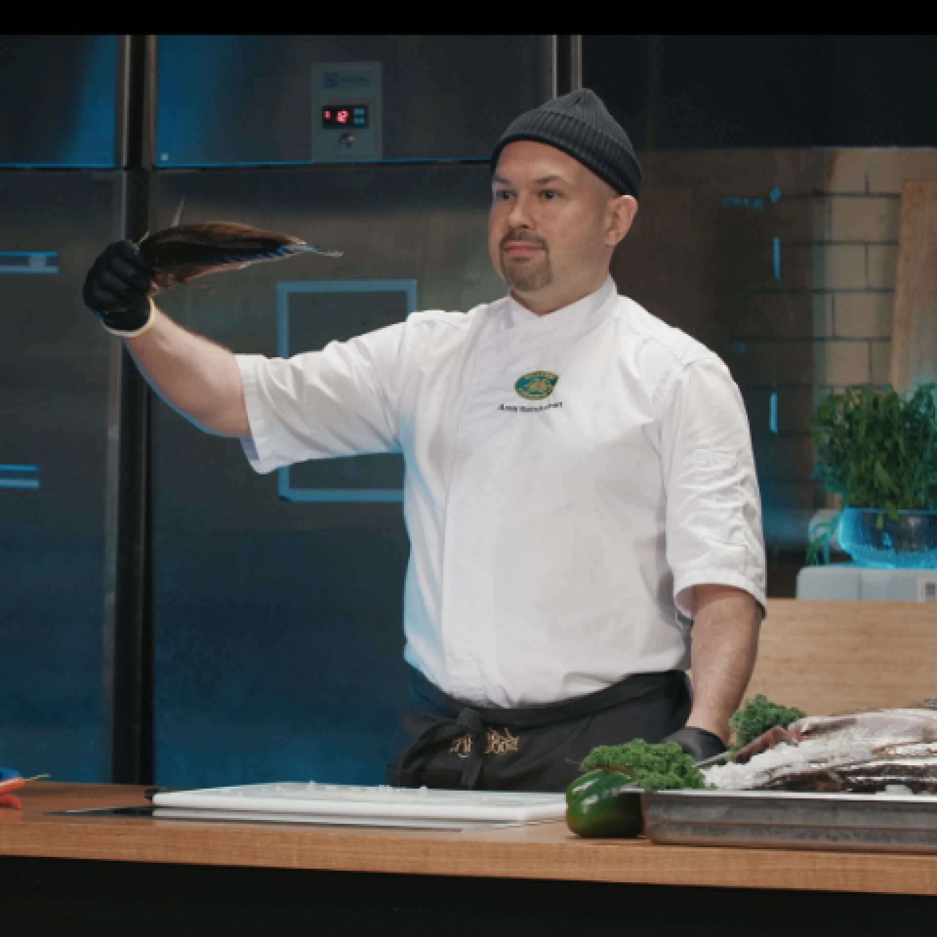 Kespron Erikoistukun Koulutusasiantuntija on esittelemässä perhosleikkaustekniikkaa, jossa meribassi avataan kauniisti kuin perhosen siivet. Ohjelmanumero sisältää leikkausnäytöksen sekä selostuksen kalan ominaisuuksista ja valmistuksesta.