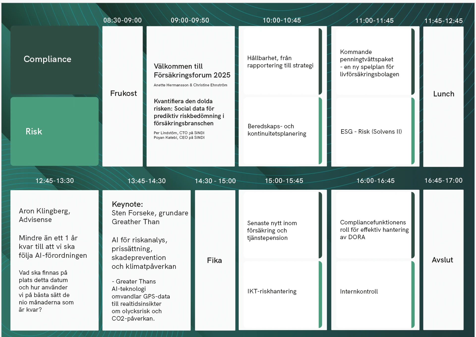 Under dagen har ni möjlighet att välja mellan presentationer inom två spår: Risk och Compliance.