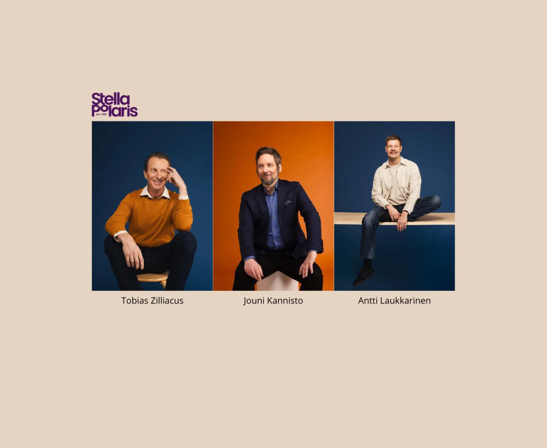 Näyttelijät Tobias Zilliacus ja Antti Laukkarinen sekä muusikko Jouni Kannisto.